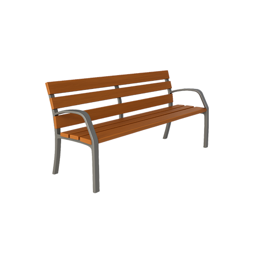 Banco urbano fabricado con pies de fundición de hierro dúctil y seis listones de madera tropical de Guinea.