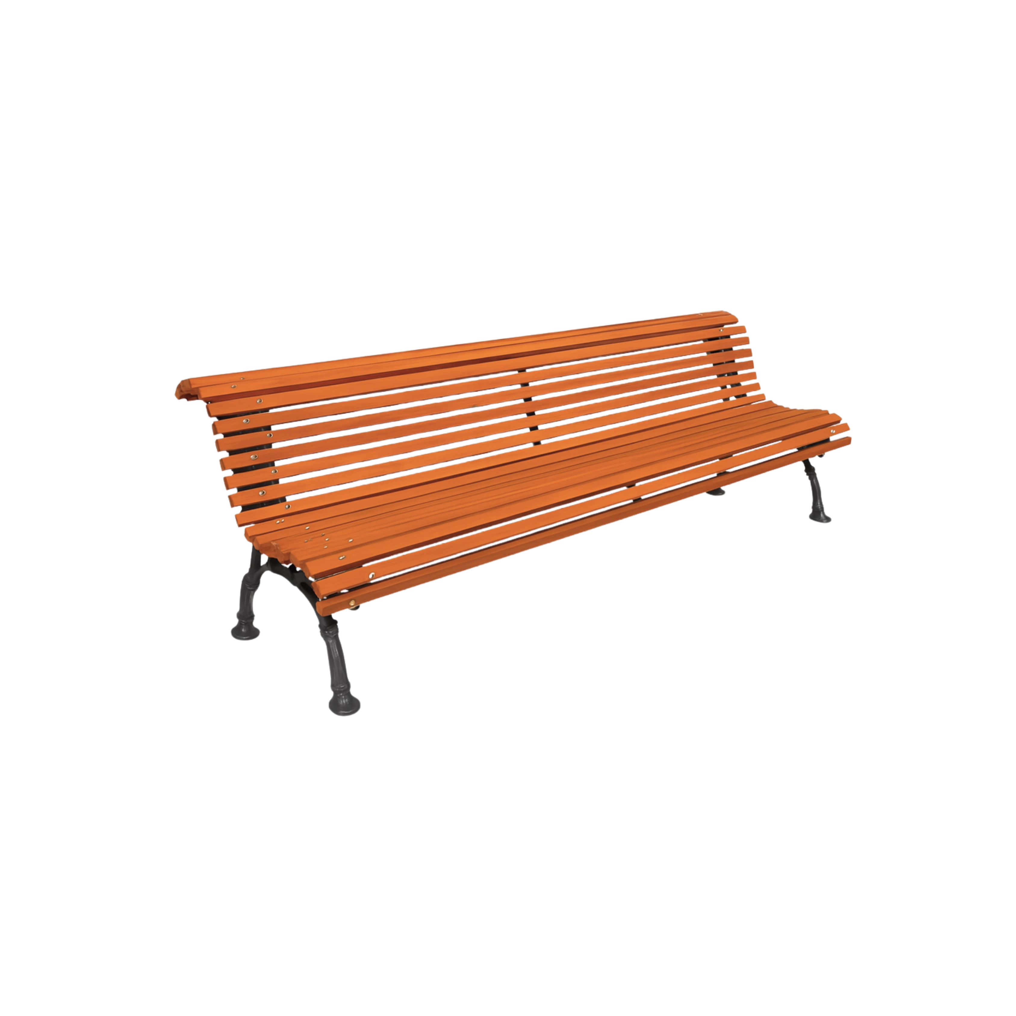 Banco urbano fabricado con tablones de madera tropical y pies en fundición dúctil, con tornillería en acero inoxidable.