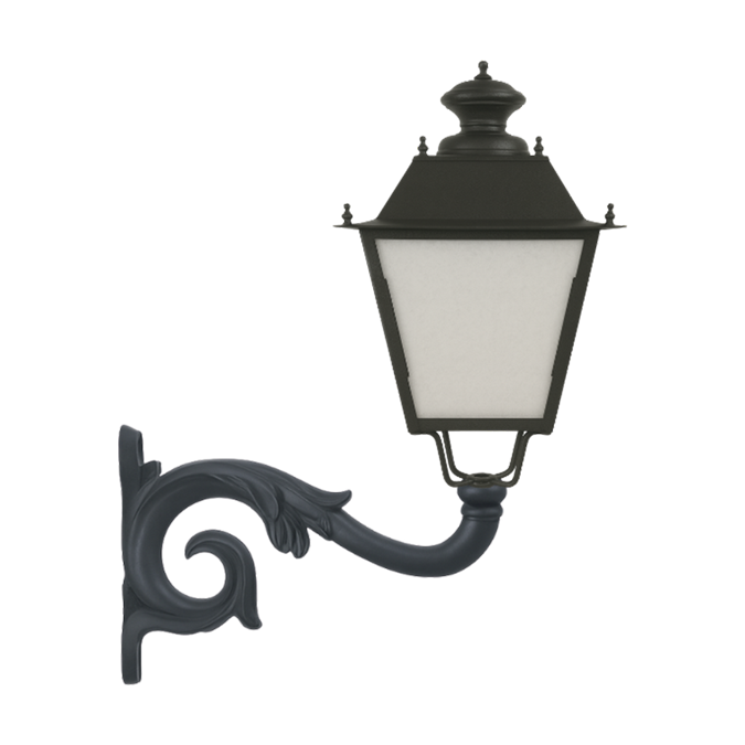 Brazo decorativo para jardín fabricado en aluminio fundido, concebido para la sujeción de luminarias, faroles y farolas en instalaciones de exterior.