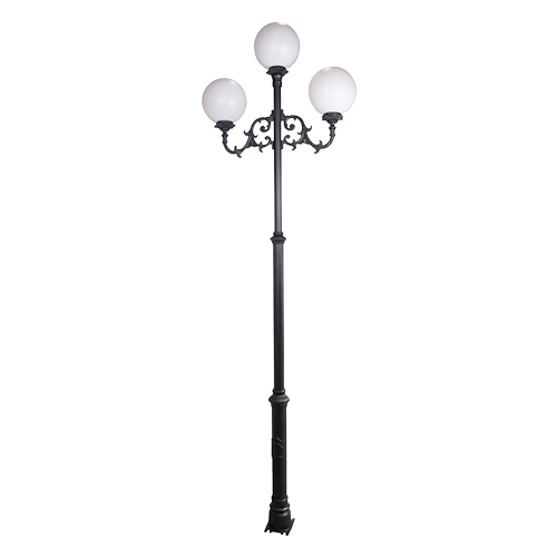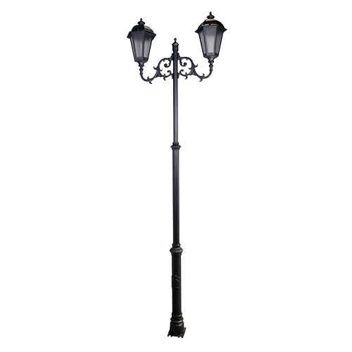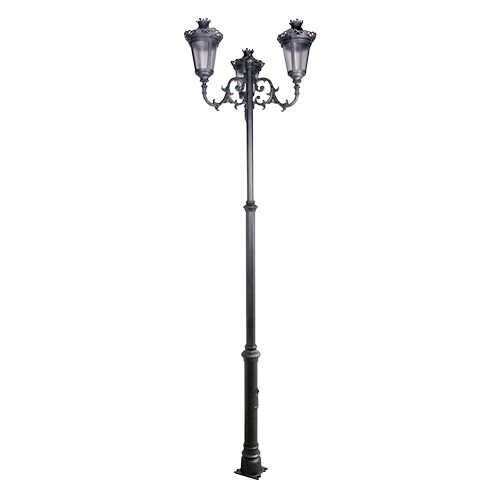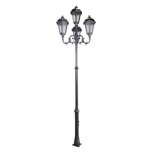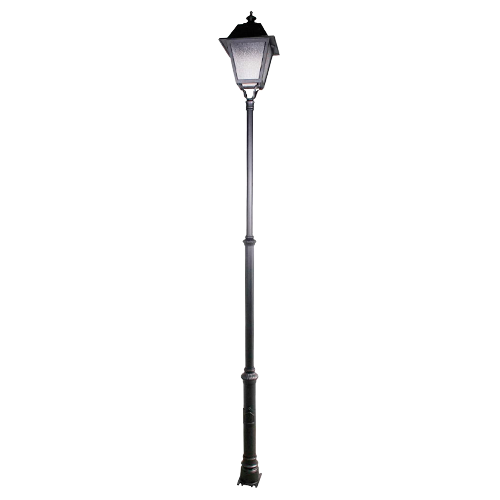 Farola fabricada en tres tramos estructurales de tubo de acero de Ø100 mm, Ø70 mm y Ø50 mm, con longitudes de 0,8 m, 1 m y 1 m respectivamente, integrando elementos ornamentales en aluminio fundido que aportan un acabado elegante y tradicional. Incorpora una base con puerta de registro y chapa reforzada para alojar el equipo eléctrico, fusibles y conexiones.