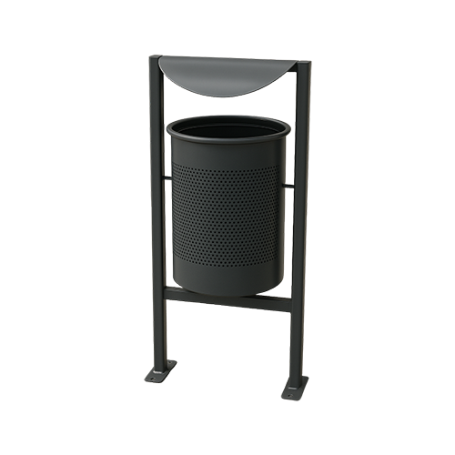 Papelera urbana basculante fabricada en chapa de acero perforada y galvanizada, equipada con tapa superior integrada.
