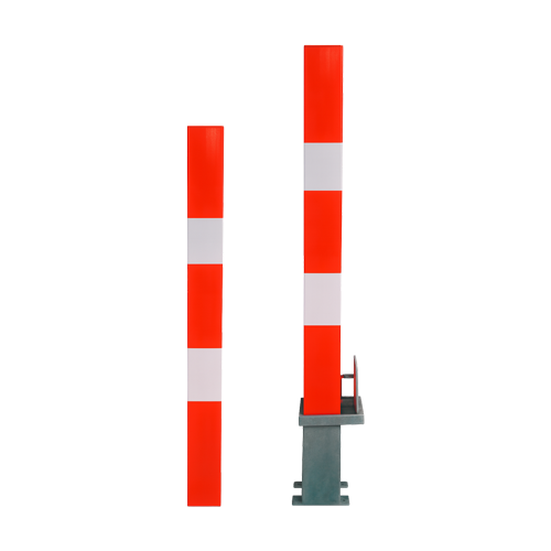 Pilona fabricada en acero zincado, equipada con bandas reflectantes para una mayor visibilidad.