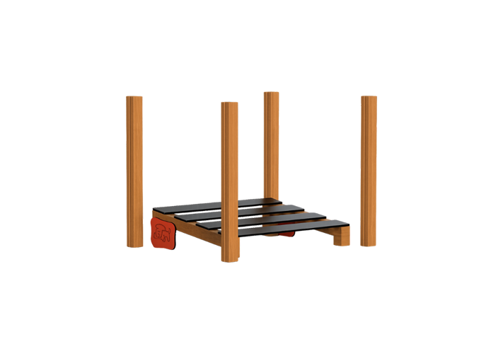 Elemento de ejercicio fabricado con panel de polietileno de alta densidad y postes de madera tratada para exteriores, con tornillería galvanizada protegida.