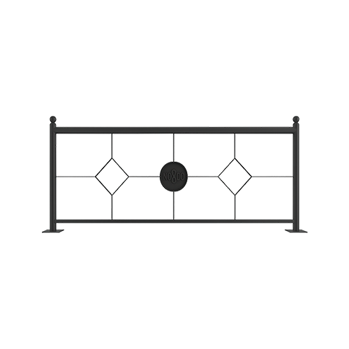 Valla fabricada en acero, compuesta por elementos modulares que permiten configuraciones continuas. Formada por pletinas dispuestas en cuadrícula e incorporando el anagrama del Ayuntamiento de Sevilla (NODO).